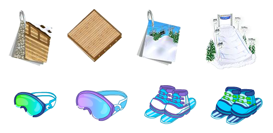 More Chalet stuff, and next year’s Deluxe Membership prize. Top row: Chalet Wallpaper, Chalet Flooring, Ski Slopes Wallpaper, and the Half Pipe (the deluxe prize that was designed by someone on WKN). Bottom row: We finally get skis!!!!!1!!1!