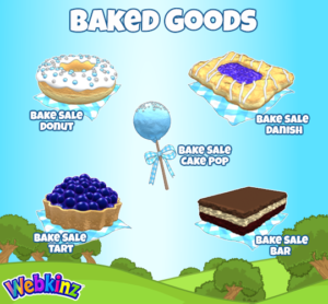 The five Baked Goods for this Bake Sale are the: Bake Sale Bar, Bake Sale Cake Pop, Bake Sale Danish, Bake Sale Donut, and Bake Sale Tart. There will also be a Blueberry Prize Pie available for purchase from the eStore and it is shown below.